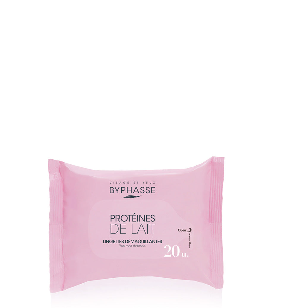 Descripción: Las toallitas limpiadoras de Byphasse limpian tu rostro de forma rápida y eficaz en un solo gesto, cuidando tu piel. Su fórmula contiene proteínas de leche, con propiedades hidratantes y tonificantes. Se elimina todo residuo de maquillaje. Prácticos de usar, llévalos contigo a todas partes.